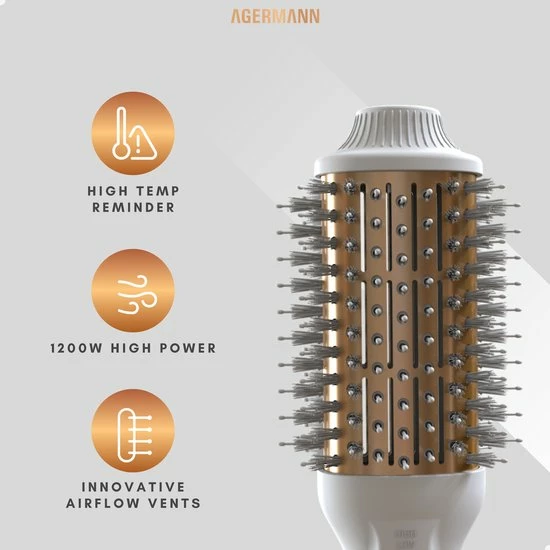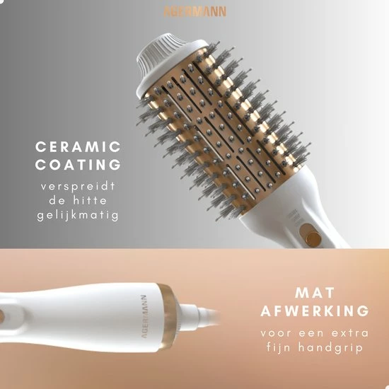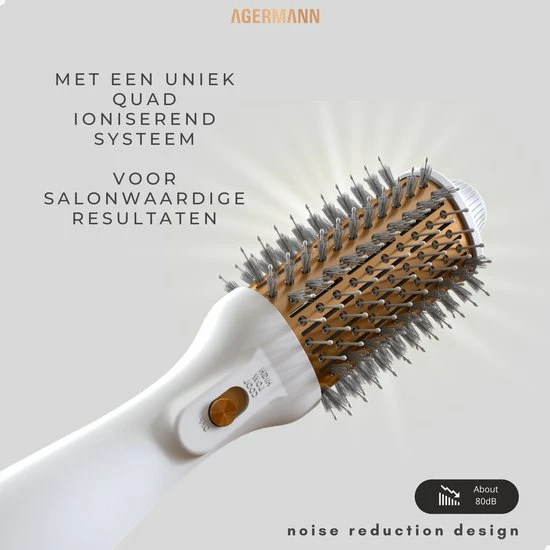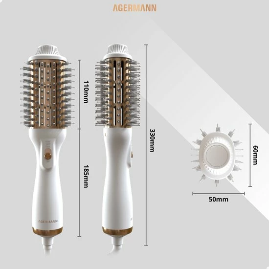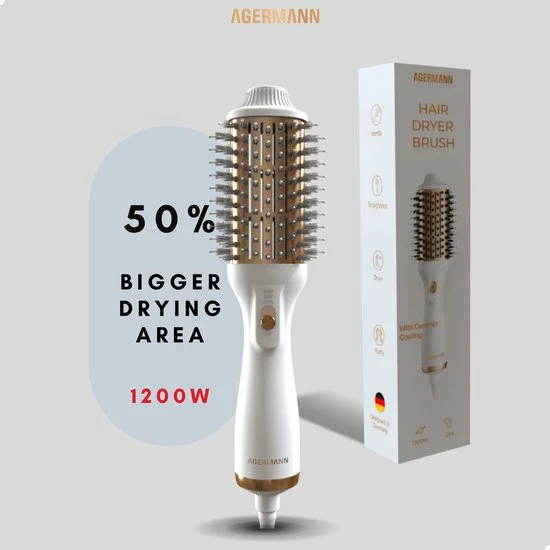 Agermann’s nieuw ontwikkelde product maakt gebruik van een nieuw ontwerp met de nieuwste technologieën. Föhn en Style je haar tegelijkertijd met de 4-in-1 föhnborstel. De borstel combineert een föhn, krulborstel, haarborstel en stijltang in één. Geschikt voor elk haartype, elke haardikte of voorkeur dankzij 3 blaasstanden, waaronder een koude-lucht stand. De föhnborstel droogt niet alleen het haar, maar voedt en verzorgt de haarwortels zelfs door de meeste nieuwe technologiën. Halveer de tijd die je nodig hebt voor droog en glanzend haar zonder pluis met maximaal volume!