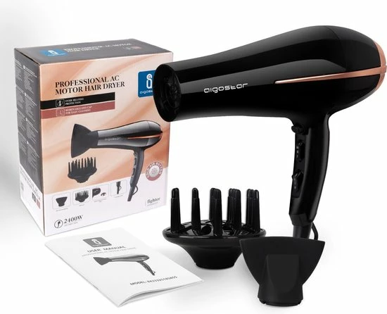 Aigostar?s nieuwste haardroger heeft een vermogen tot wel 2400 Watt en beschikt over 3 warmtestanden en 2 snelheden. Bovendien schakelt de haardroger zichzelf uit als het oververhit raakt en kun je hem weer gebruiken wanneer het is afgekoeld. Dit in combinatie met het extra dikke snoer van 2.4 meter zorgt ervoor dat ze erg veilig in gebruik is.