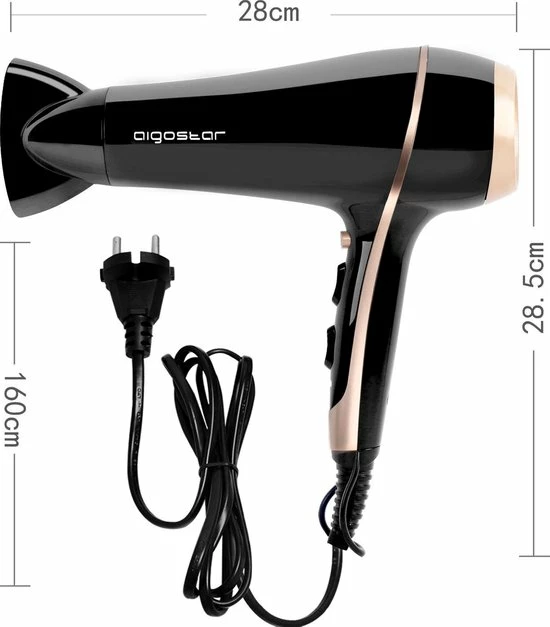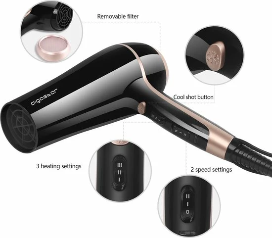 Aigostar?s nieuwste haardroger heeft een vermogen tot wel 2400 Watt en beschikt over 3 warmtestanden en 2 snelheden. Bovendien schakelt de haardroger zichzelf uit als het oververhit raakt en kun je hem weer gebruiken wanneer het is afgekoeld. Dit in combinatie met het extra dikke snoer van 1.75 meter zorgt ervoor dat ze erg veilig in gebruik is.