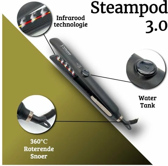 De Steampod 3.0 is ‘s werelds meest geavanceerde stijltang. Het combineert twee technologie?n in ??n om snellere resultaten te leveren dan ieder ander product op de markt. De keramische platen van de Steampod en de infrarood verwarmingsfunctie zorgen samen voor een slanke, gebruiksvriendelijke stylingtool waarmee je haar er gezonder, glanzender en gladder uitziet dan ooit tevoren. Snel last van droge en gespleten haarpunten? De Steampod 3.0 voorkomt dat de haarpunten niet uitdrogen en afbreken, door middel van de stoomfunctie in combinatie met de infrarood functie. De Steampod 3.0 zorgt er voor dat jouw prachtige look voor minstens 4 dagen in model blijven zitten.