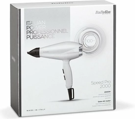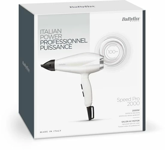 Deze Speed Pro 2000 f?hn 6704WE van BaByliss heeft een professionele AC-motor. Dit is een krachtige motor die tot wel 100 km/uur lucht blaast en 5x langer meegaat dan een haardroger met een DC-motor. Dat geeft de garantie op deze f?hn ook aan, want je krijgt 5 jaar garantie!