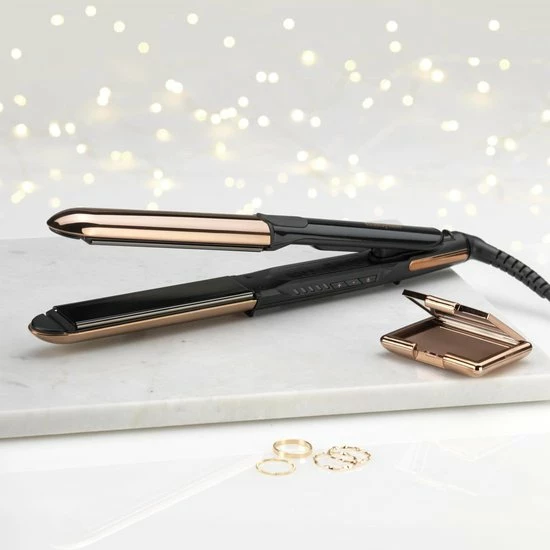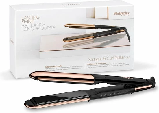 De Straight & Curl Brilliance Stijltang ST482E van BaByliss is de sterkste stijltang ?n 2 in 1 binnen de gehele collectie. Dit komt door het gebruik van twee materialen. E?n door titanium, want dit maakt de platen glad en sterker, waardoor ze beter bestand zijn tegen haarstylingsproducten ?n door de behuizing van RVS. Dit zorgt ervoor dat de platen, door de warmte, op den duur niet verbuigen. De platen blijven dus altijd mooi op elkaar aangesloten. Zo krijg je je haar in ??n keer mooi steil of gekruld. Krullen kan namelijk ook doordat de buitenkant van de stijltang ook wordt verwarmd. Pak de cooltips aan het uiteinde van de stijltang vast, zodat je het haar kan krullen.