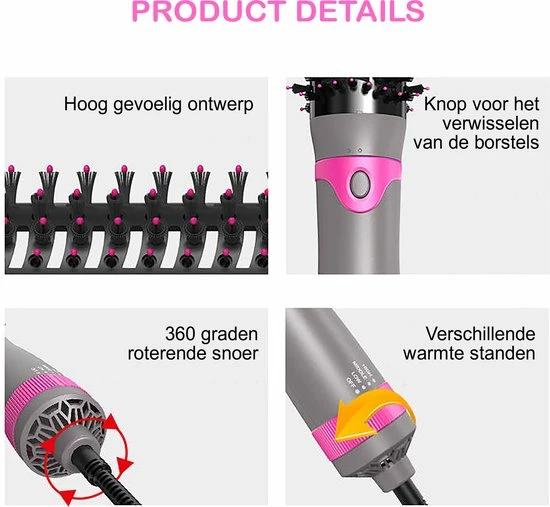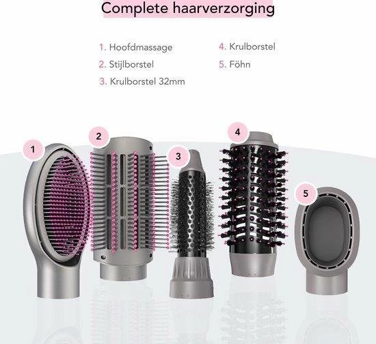 Met deze 5 in 1 föhnborstel is het mogelijk om haren te drogen en te stylen. De föhnborstel heeft 5 verwisselbare opzet stukken die gebruikt kunnen worden om het haar in het gewenste model te krijgen. De multistyler beschikt over de volgende opzetstukken: föhn, stijlborstel, twee verschillende maten krulborstels en een hoofdmassageborstel. De föhnborstel beschikt over 3 verschillende temperatuur- en blaasstanden met een perfect verdeelde luchtstroom (laag, medium en hoog). Hierdoor is de borstel geschikt voor ieder haartype en haardikte.