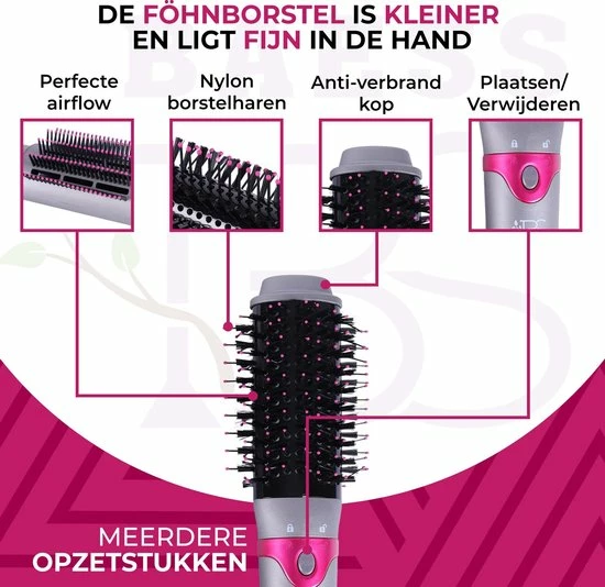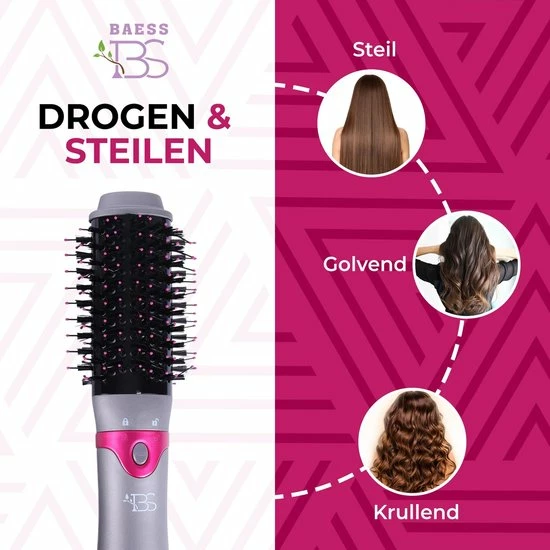 Wil je dat jouw haar er verzorgd en stralend uitziet? Deze 5 in 1 föhnborstel van BAESS droogt je haar en kan daarnaast gebruikt worden voor de styling van je haar. Door de 5 verschillende opzetstukken kan je in een handomdraai diverse haar looks creëren; van een steil tot een krullend kapsel. Met deze multistyler van BAESS kan je haar veranderen van pluizig en futloos in zacht en glanzend. De föhnborstel van BAESS is geschikt voor ieder haartype en houdt je haar gezond en zijdezacht.