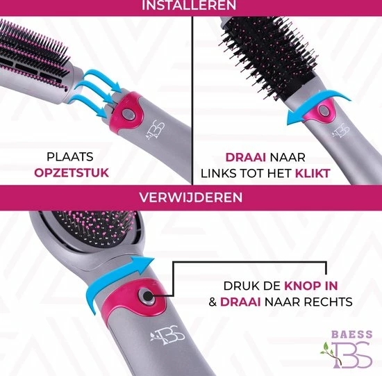 De multistyler van BAESS maakt een einde aan alle verschillende föhns en borstels die je voorheen nodig had. De föhnborstel wordt met maar liefst 5 verschillende opzetstukken geleverd. De opzetstukken zijn gemakkelijk te verwisselen; via een draai en kliksysteem zijn de opzetstukken eenvoudig aan en af te koppelen. De föhnborstel is makkelijk in gebruik te nemen door zijn lichte gewicht en comfortabele handligging. Daarnaast is de borstel voorzien van een 360° meedraaiend snoer van bijna 2 meter wat zorgt voor voldoende bewegingsvrijheid tijdens het drogen en stylen van het haar.
