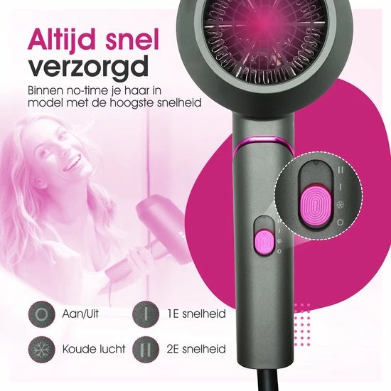 Met deze BAESS f?hn kunt je jouw haar drogen op een constante verzorgende temperatuur. Deze f?hn beschermt jouw haar tegen oververhitting. Er zijn 3 verschillende temperatuur/snelheidsstanden; koude lucht, warme lucht met normale snelheid en warme lucht met verhoogde snelheid. De f?hn beschikt over twee opzetstukken: een mondstuk en een diffuser. Met deze f?hn kan je jouw haar binnen 5 minuten drogen en dankzij de koude lucht functie is jouw haar makkelijk in jouw gewenste model te brengen. Jouw bad hair days gaan met deze f?hn tot het verleden behoren.
