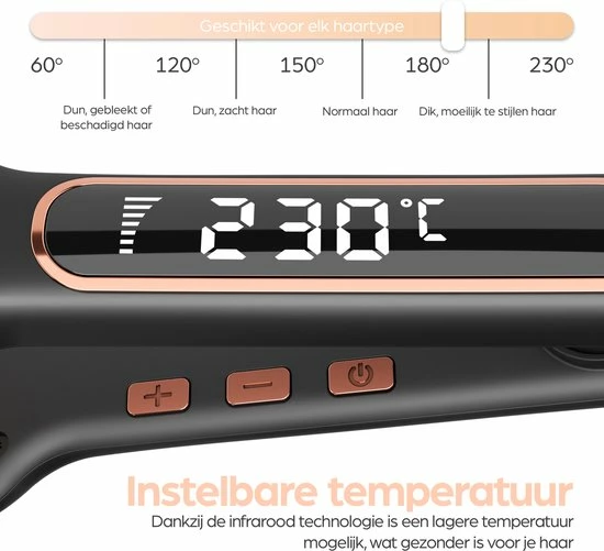 Afhankelijk van je haarstructuur kun je zelf de temperatuur instellen van 60 ?C tot 230 ?C. Hierdoor is het geschikt voor elk haartype. Van dun, beschadigd haar tot dik, grof haar dat moeilijk te stijlen is. Daarnaast is de stijltang snel opgewarmd zodat je nooit lang hoeft te wachten.