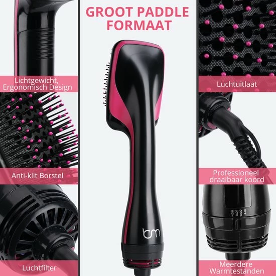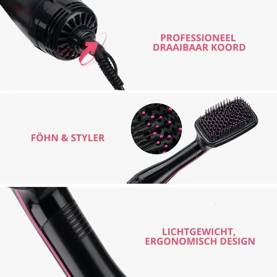 Geen geklungel met een borstel in de ene hand en een f?hn in de ander. De flexibele nylon pins en borstelharen zorgen voor zijdezacht en klittenvrij haar. Bovendien geeft het 2 meter lange 360? meedraaiend snoer je volledige bewegingsvrijheid.