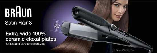 De Braun Satin Hair 3 straightener met extra brede platen zorgt voor efficiënt stylen met maximale haarbescherming dankzij de temperatuurregulering en de zwevende 100% keramische platen. De brede platen zijn ideaal voor half lang en lang haar, superhandig in gebruik en altijd bij de hand voor een perfect resultaat binnen een mum van tijd.