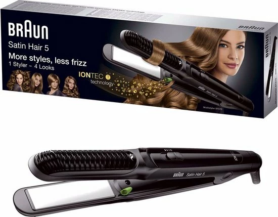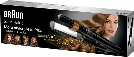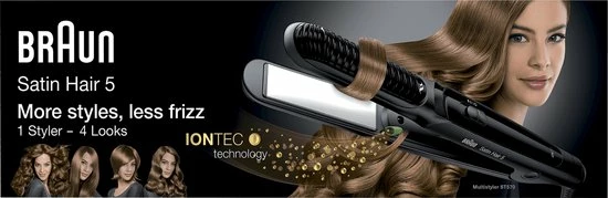 De Braun Satin Hair 5 IONTEC multistyler gebruikt de revolutionaire IONTEC-technologie om ervoor te zorgen dat je haar niet statisch wordt zoals bij sommige conventionele haardrogers. Het geheim zit in de miljoenen actieve ionen die vrijkomen als je met de multistyler door je haar gaat. Deze actieve ionen werken als een conditioner, omhullen iedere lok en herstellen snel het vocht dat door de enorme hitte bij het stylen verloren kan gaan. Het haar pluist niet en heeft een hernieuwde gladheid en glans.