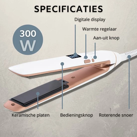 De stijltang heeft een vermogen van 300W waardoor de stijltang zelfs de meest krullende lokken effectief recht maakt.