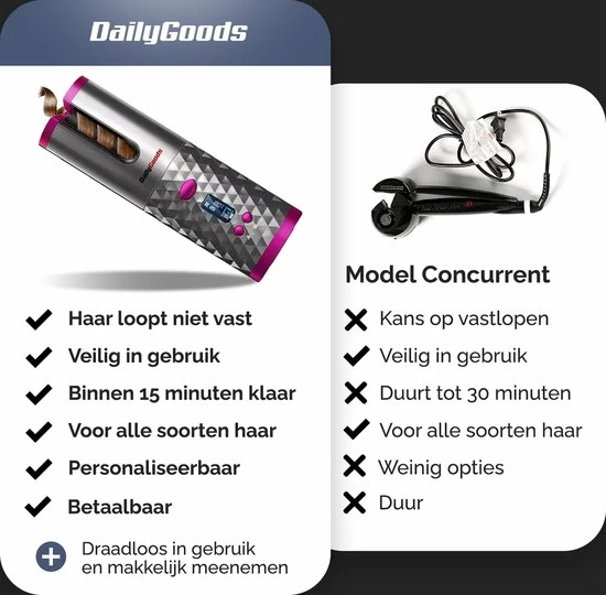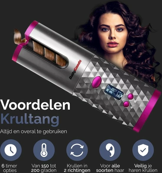 Mooie krullen die de hele dag blijven zitten en waarvoor je niet uren lang bezig met met een krultang. Is dat waar jij naar op zoek bent? Dan is de automatische krultang van Dailygoods precies wat jij nodig hebt! De krultang is makkelijk in gebruik, overal bruikbaar en creert de perfecte krul in een mum van tijd. De keramische laag van deze haarkruller zorgt voor weelderige krullen die lang blijven zitten. Benieuwd naar alle andere voordelen? Lees ze hieronder: