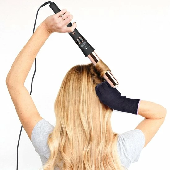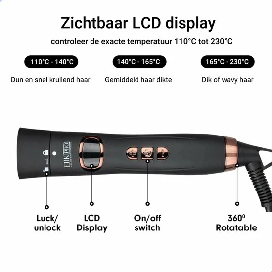 Wanneer de krultang niet gebruikt wordt, schakelt het product zichzelf na 60 minuten uit. De wamtebestendige handschoen wordt voor de veiligheid aangeraden. De temperatuur is handmatig in te stellen tussen 60 ?C en 220 ?C en dit is af te lezen op het lcd-scherm. Lees de veiligheidsinstructies op bijgeleverde folder goed door (Engels).