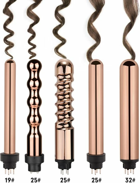 Ionentechnologie / Keramische wamte-elementen / 3 x Rechte Krultang 19 mm – 25 mm – 32 mm / 1 x Bubble Krultang 25 mm / 1 x Spiraal Krultang 32 mm / Toermalijn keramiek / Instelbare temperatuur