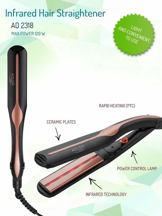Moderne stijltang met infraroodtechnologie en uitgerust met keramische platen die zorgen dat je haar een mooie en frisse uitstraling krijgt.
