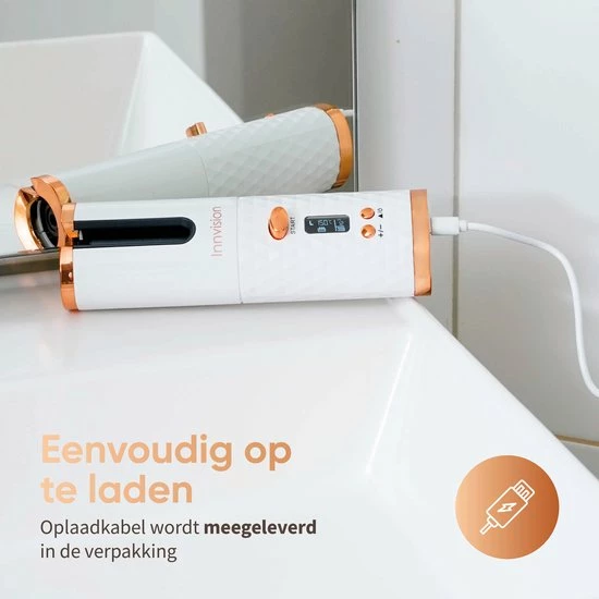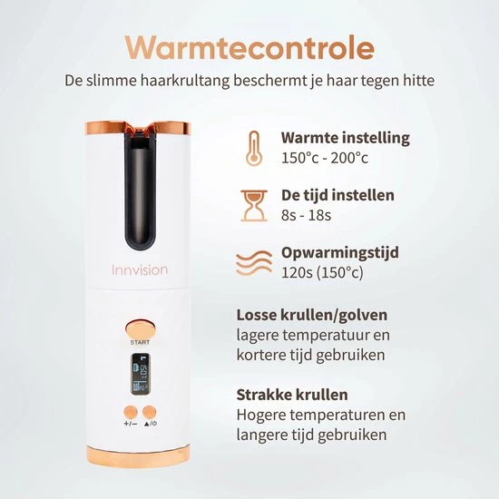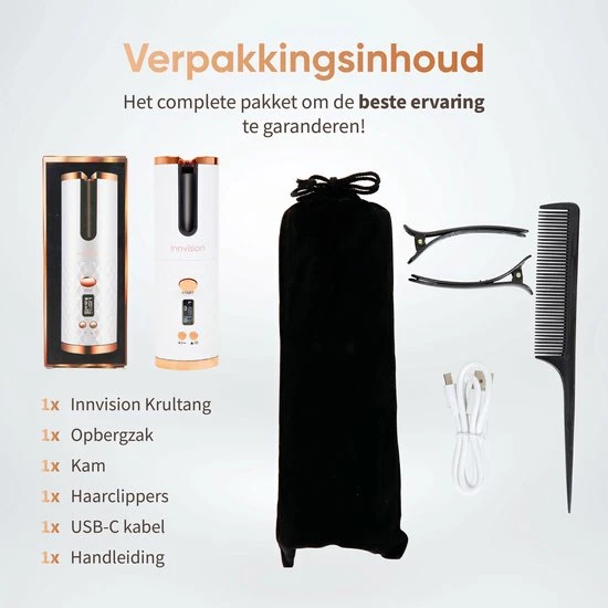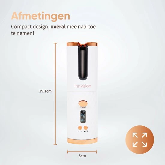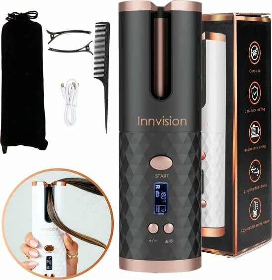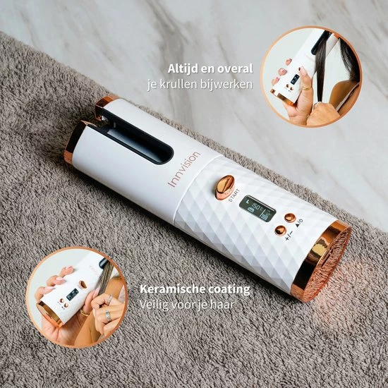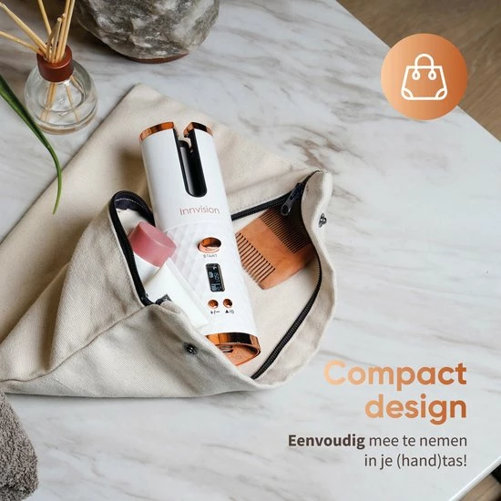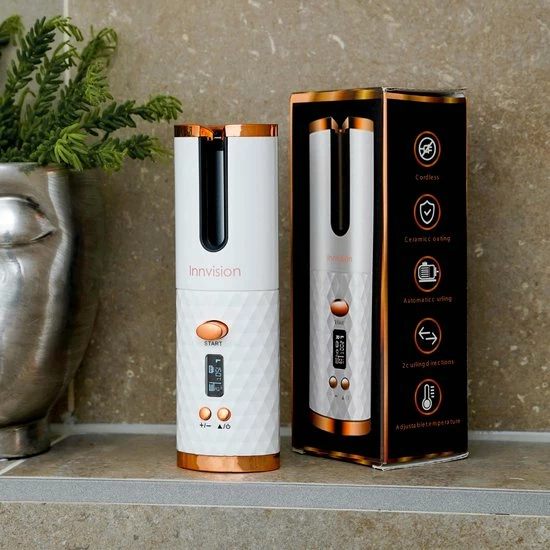 Wil jij ook altijd en overal mooie krullen? Met de Innvision automatische krultang heb je altijd een draadloze krultang bij de hand, en maak je met een druk op de knop de krullen die jij wilt. Maak prachtige beachy waves of pijpekrullen in een handomdraai! De automatische krultang is veilig in gebruik, want je handen komen niet in de buurt van het hitte-element. Dankzij het compacte formaat is de krultang gemakkelijk mee te nemen in je handtas en kun je deze dus altijd en overal gebruiken.
