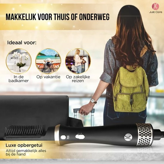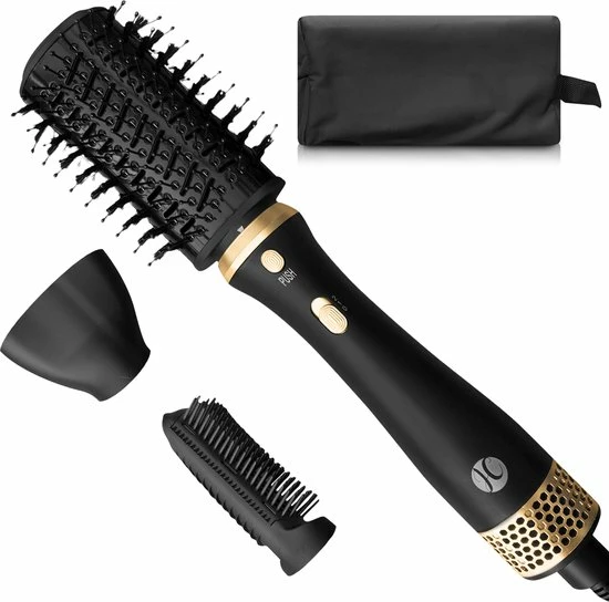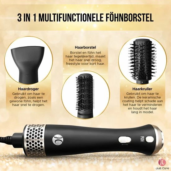F?hn en Style je haar tegelijkertijd met de JC multifunctionele f?hnborstel. De borstel combineert een f?hn, krulborstel en stijltang in ??n. Geschikt voor elk haartype, elke haardikte of voorkeur dankzij de verschillende opzetstukken en temperatuurstanden. Het krulborstel opzetstuk is voorzien van een keramische coating ter bescherming van het haar. De ionische technologie voorkomt statisch en droog haar. Perfect voor op reis of onderweg dankzij de handige opbergetui! Let op: artikel is alleen niet geschikt voor korthaar ivm diameter van de borstel.