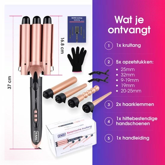 Met de raveg krultang kan je simpel afwisselen met verschillende temperaturen en kan je vanuit meerdere posities een mooie bos krullen maken. En de 5 opzetstukken zorgen ervoor dat je handig en flexibel zelf krullen kan maken waarvan je een lach op je gezicht krijgt!