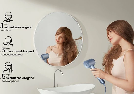 【Hoge snelheid borstelloze motor en sneldrogend】 De Laifen-föhn is uitgerust met een borstelloze motor met hoge snelheid van 110.000 tpm, de windsnelheid bereikt 22 m/s. Een sterke luchtstroom kan het haar in korte tijd drogen, wat 2x sneller is dan traditionele haardrogers. Gewoonlijk duurt het 2-8 minuten om het haar te drogen, afhankelijk van de lengte en dikte van het haar.