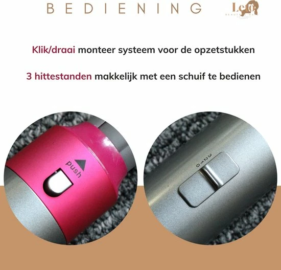 De airwrap is uitgerust met een eenvoudige temperatuurregelaar. Je kunt hierbij kiezen uit 3 verschillende hitte standen met een bereik van 61? ? 140?C, deze kun je eenvoudig vastzetten zodat de temperatuur niet plotseling kan gaan wisselen.