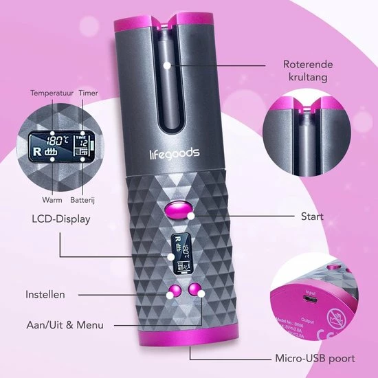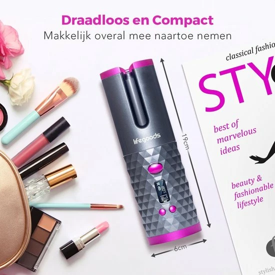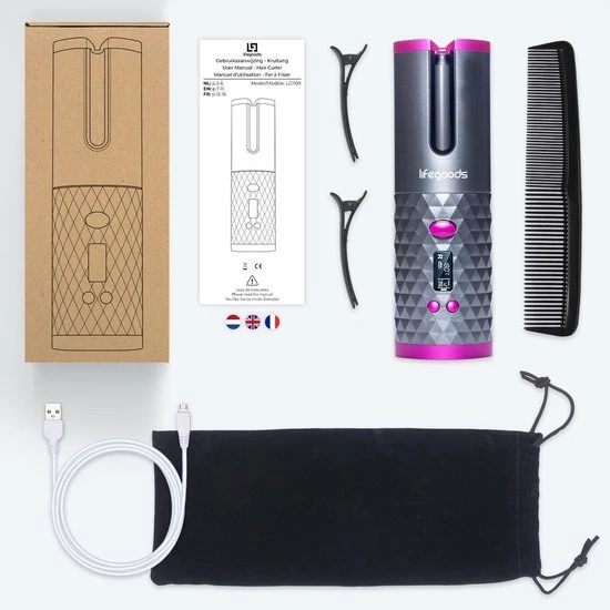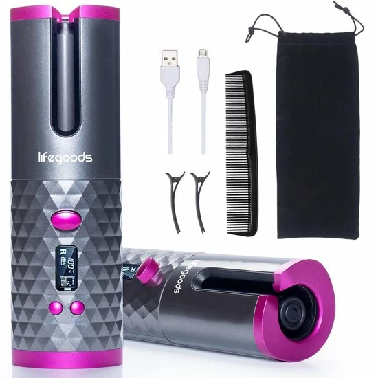 Altijd en overal mooie krullen? Neem de draadloze krultang van LifeGoods overal mee naartoe! Gebruik het LCD display om de temperatuur en de tijd in te stellen. Het krulijzer is USB oplaadbaar en zeer compact. Zelfs in een kleine handtas makkelijk mee te nemen! Dankzij de dubbele keramische isolatie is de kruller zeer veilig in gebruik. Je kunt zowel rechts- als linksom krullen. Je krijgt bij de krultang een handig draagtasje, een kam, krulspelden en een duidelijke handleiding. Een complete set voor de perfecte krul thuis, onderweg of op kantoor!