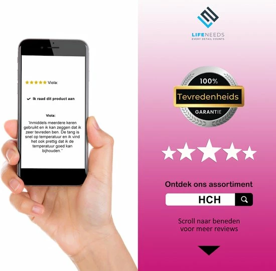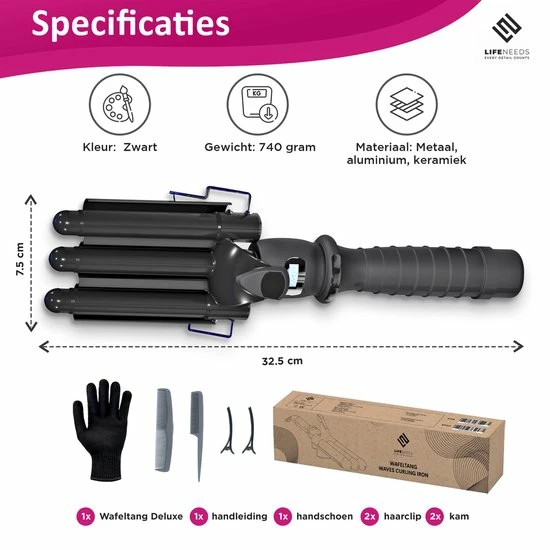 Inhoud: 1x Wafeltang Deluxe, 1x handleiding, 1x handschoen, 2x haarclip, 2x kam