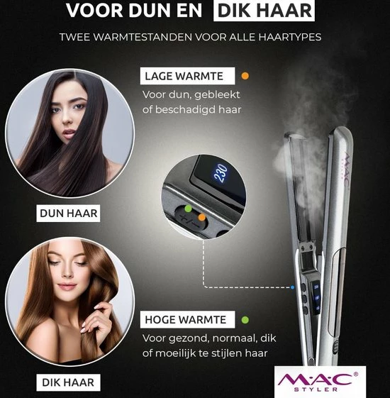 De MAC Styler stoom stijltang heeft een grote doelgroep en is bedoeld voor iedereen die wilt genieten van gezonde en glanzende haren. De stijltang met stoom is geschikt voor ieder haartype en heeft daardoor de mogelijkheid om iedereen te voorzien van de beste gebruikservaring en het mooiste resultaat. Krullen, kroes, afro of onhandelbaar haar, met de MAC Styler stoom stijltang ontdekt u het mooiste resultaat. De stijltang bezit over twee warmtestanden: 180-230°C. Voor dikkere haren raden wij aan dat u de hogere temperatuur gebruikt. Voor dunnere haren is de lage temperatuur optimaal. Welke temperatuur u ook kiest, u zult tijd besparen en sneller klaar zijn dan gebruikelijk. Door de ionische functie zal uw haar niet statisch worden.