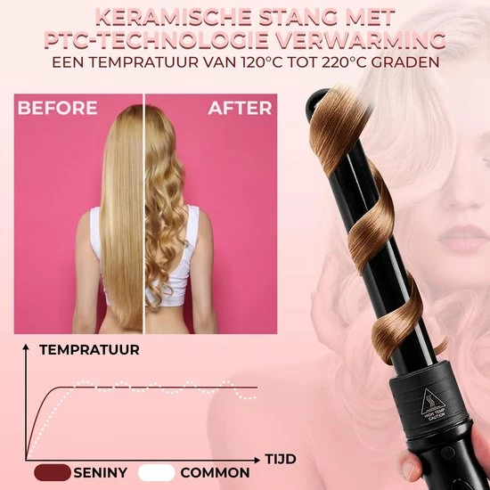 De krultang is speciaal ontworpen met een keramische coating, zodat je haar een glanzende uitstraling krijgt en dit behoudt gedurende de dag. Het heeft een maximale tempratuur van 220?C en is daarmee uitermate geschikt voor alle haartypes. Daarnaast heeft het een compact formaat en het is zeer licht in gewicht, wat ervoor zorgt dat je het gemakkelijk en snel kan meenemen en opbergen zonder dat het veel ruimte in beslag zal nemen.