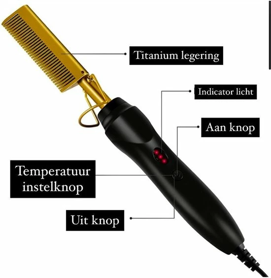 Deze Hot Comb zit boorde vol kwaliteiten. Je kan namelijk de temperatuur van de kam naar je eigen wensen instellen, zo voorkom je problemen met een te hete kam. Doordat het product uit een uitneembare kam bestaat, beschermt het de huid tegen de hete verwarmingsplaat. Het antigrip handvat zal er voor zorgen dat de kam niet uit je handen valt.
