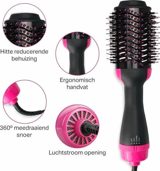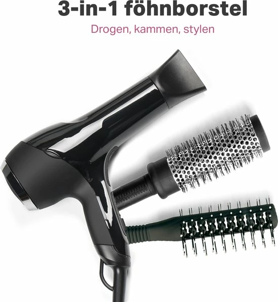 Stijl en droog jouw haar in een mum van tijd met deze 1000W F?hnborstel. Het grote formaat van deze borstel zorgt voor een snel droogresultaat. Je kan tijdens het drogen tegelijkertijd je haren stijlen, volume cre?ren, een slag aanbrengen en mogelijk een klein krulletje cre?ren.