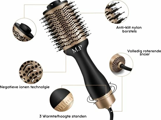 Je haar direct uit de douch tegelijk drogen en in model brengen? Dat kan! Met de 3-in-1 föhnborstel van M.P. De unieke borstel die een combinatie is van een stijltang, krulborstel en föhn beschikt over 2 blaasstanden die je in 3 verschillende warmte standen, van koud naar heet kunt configureren. Op de hoogste stand zal de föhn dankzij een ingebouwd mechanisme nooit over verhit raken. Ideaal dus om lekker lang door te föhnen terwijl je haar maximaal beschermd wordt. Hierbij beschikt de föhn ook over een goudkleurige keramische coating die het haar verdere bescherming biedt tegen directe hitte. Dankzij de ingebouwde ionen technologie wordt er voorkomen dat het haar pluizig wordt en zul je daarentegen mooi zacht haar hebben. Geschikt voor ieder haartype.