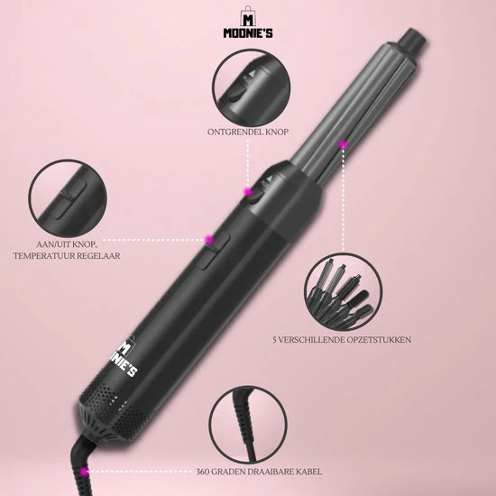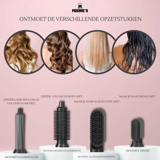 ▶ Inhoud pakket: MOONIE’S® 5 in 1 Multistyler, MOONIE’S® Haarkruller, MOONIE’S® Ronde Volumeborstel, MOONIE’S® Gladmakende Borstel, MOONIE’S® Dryer.