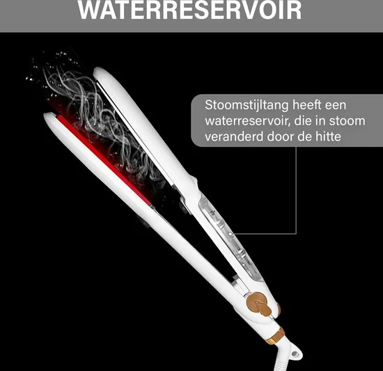 Deze stoomstijltang geeft door middel van de stoomgenerator jouw haar een gladde textuur. De stoomstijltang heeft een waterresevoir die gevuld moet worden met water om de stoom te kunnen cre?ren. Door middel van de ingebouwde infraroodsysteem die in aanmerking komt met stoom zorgt het ervoor dat je haar met 80% minder beschadigd dan een tradionele stijltang.