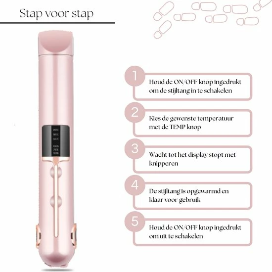 De bediening van de stijltang is ook super simpel. Door de vergrendelknop aan de zijkant in te drukken ontgrendel je de stijltang. Als je hierna ON ingedrukt houdt dan zal de stijltang aangaan en kun je op het display de batterij status aflezen. Als hierna geen keuze in temperatuur wordt gemaakt zal deze ook weer vanzelf uitschakelen. Bij een enkele druk op de TEMP knop kun je kiezen uit de 3 temperatuur instellingen 165?C, 185?C en 205?C.