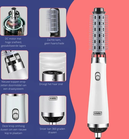 Droog en styleer je natte haren op de meest veilige manier met de Raveg f?hnborstel. De luxe f?hnborstel met meerdere koppen en ionentechnologie is speciaal ontworpen om 100% veilig te f?hnen. Dankzij de motor van 1200W f?hn jij je haar in enkele minuten droog. De f?hnborstel droogt niet alleen het haar, maar voedt en verzorgt de haarwortels zelfs door de meeste nieuwe technologi?n.