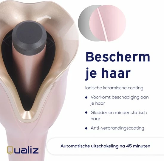 Zoek je een krultang die je haar beschermt? Dan is de Qualiz automatische krultang perfect. De keramische coating op de krultang zorgt er namelijk voor dat je haar niet beschadigd. Naast dat het je haar beschermt, voorkomt het ook kroeshaar. Tijdens het krullen van het haar vindt er egale warmteverspreiding plaats, waardoor elke pluk dezelfde hoeveelheid warmte krijgt van de tang. Hierdoor behoud je ook de gezondheid van het haar. De krultang beschikt ook over een anti-verbrandingscoating.