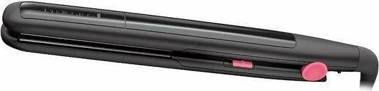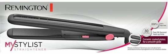 Remington S1A100 My Stylist stijltang, ErgonomieIngebouwd display: Nee, Aan/uitschakelaar: Ja, Automatisch uitschakelen: Ja, Draadloos: Nee, Snoerlengte: 1,8 m, Automatische uitschakeling na: 60 min, DesignKleur van het product: Zwart, Roze, Plaatmateriaal: Keramisch, PrestatieSoort: Stijltang, Technologie: Warm, Haarontkrullen: Ja, Haarkrullen: Nee, Haartextureren: Nee, Haardrogen: Nee, Ionenconditioner: Nee, Keramisch verwarmingssysteem: Ja, Instelbare thermostaat: Nee, Aantal temperatuurstanden: 1, Temperatuur (max): 200 ?C, Opwarmtijd: 30 s