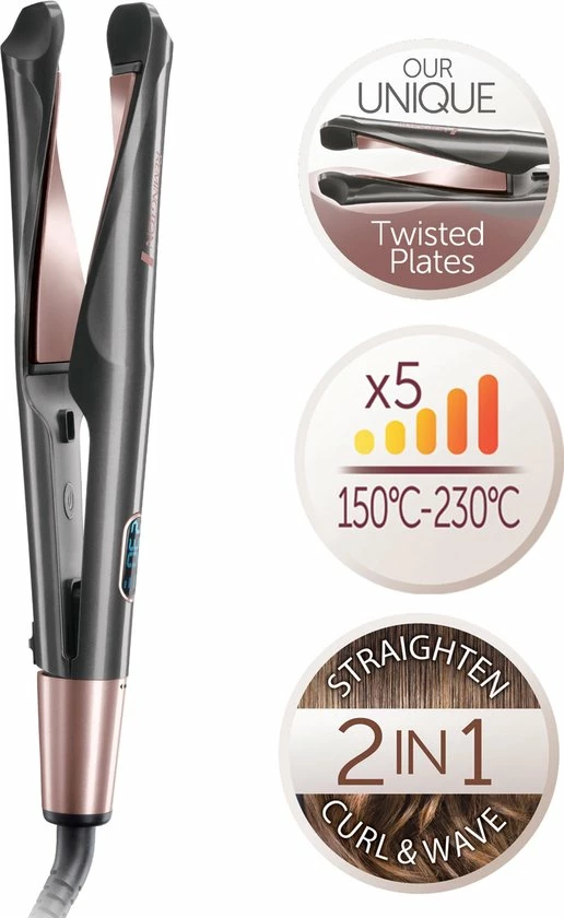 - Digitale temperatuurstand: 5 temperatuurinstellingen van 150-230 ?C. Geschikt voor alle haartypen.