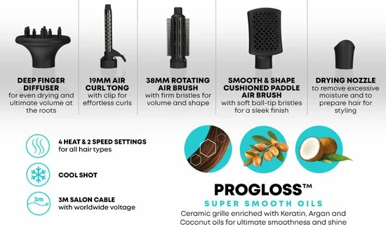Alle opzetstukken van de airstyler zijn voorzien van de gepatenteerde Progloss coating. Dankzij de zachte keratine, argan- en kokosoliën zal je haar gedurende de hele dag extra glanzen. De oliën zijn bovendien voedend. De ionentechnologie zorgt er daarnaast voor dat je haar minder pluist of statisch is. De opzetstukken geven namelijk negatief geladen ionen af die je haar omhullen en statisch haar voorkomen. Zo kun je zorgeloos de deur uit met stralend haar!