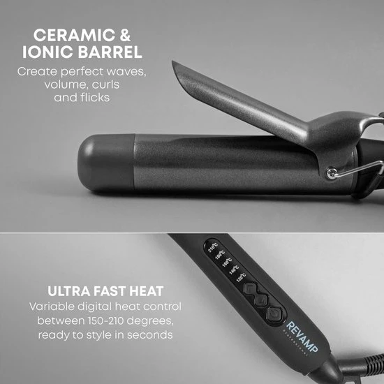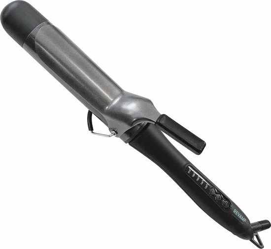 De Revamp Progloss ? Big Tong : Met een grote 38 mm hete keramische tang voor beweging, golven en krullen. Wikkel je haar voorzichtig rond de tang onder de clip in de richting van de gewenste krul. Neem voor kleinere, veerkrachtige krullen kleinere delen haar. Neem voor losse, vrij stromende krullen grotere delen haar. De Progloss ? Big Tong heeft 5 warmtestanden van 120 ? C – 210 ? C. De Progloss ? Big Tong zorgt binnen enkele seconden voor een consistente en zelfs optimale stylingtemperatuur en is perfect voor verschillende haartexturen en -types.