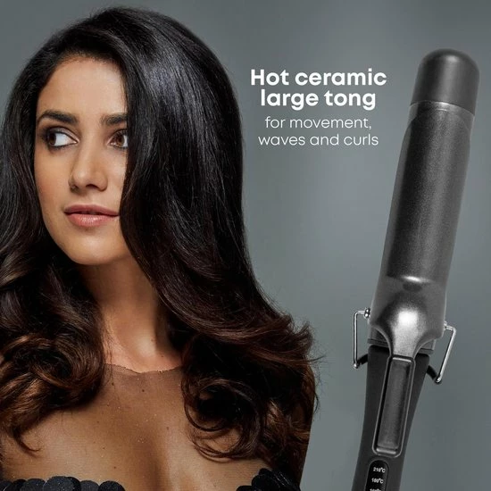 Volumineuze, glanzende krullen zijn een van de eenvoudigste manieren om je look te verfraaien. Cre?er moeiteloos losse krullen en golven met de Progloss ? verrijkte Big Tong. De Big Tong met een diameter van 38 mm cre?ert stijlen van zachte golven tot zachte krullen met professionele resultaten en een hoogglans salonafwerking. Het keramiek van deze krultang is gebakken in een ?PROGLOSS? bad dat Keratine, Arganolie en Kokosolie bevat. Dit is een unieke mix van materialen die je haar elke beurt een glans geeft en beschermt tegen de hitte.