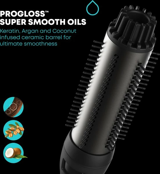 De keramische warmteborstel is gebakken in een Progloss bad en bevat hierdoor Keratine-, Argan- en Kokosnootolie. Deze unieke mix van oli?n geeft je haar elke beurt een glans en beschermt tegen de hitte.