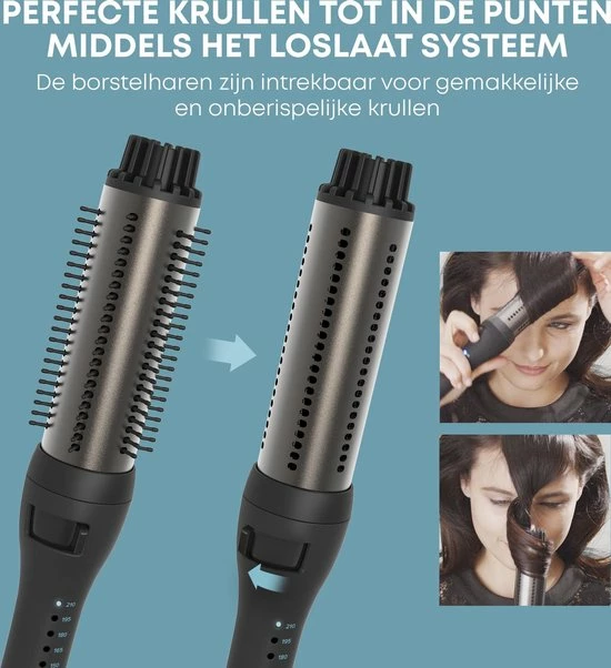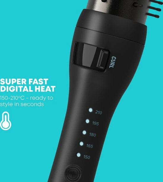De borstel warmt binnen enkele seconden op en heeft 5 verschillende temperatuurstappen (150 ?C / 165 ?C / 180 ?C / 195 ?C / 210 ?C). Hierdoor is de krulborstel ook geschikt om dun en beschadigd haar te krullen. Een ledlampje op de temperatuurindicator zal aangeven of de geselecteerde temperatuur is bereikt.