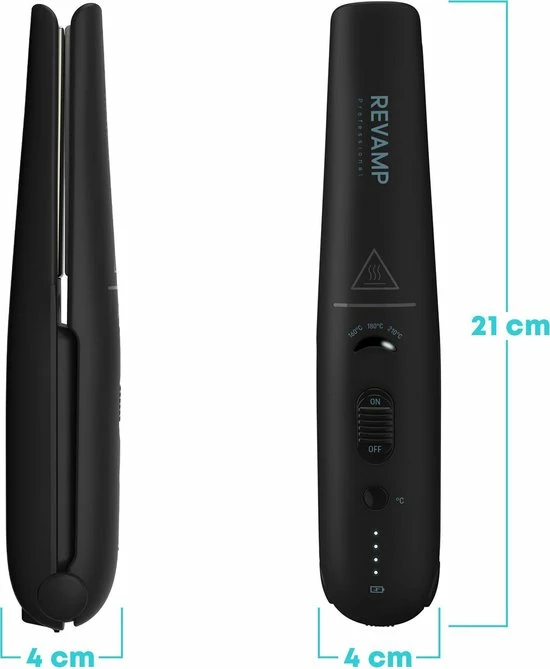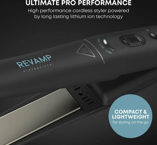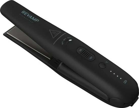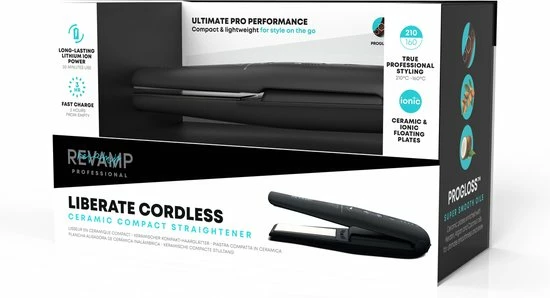 De Revamp Progloss ST-1700 Liberate maakt het mogelijk om je haar te stylen waar je ook bent. De stijltang is compact en is draadloos tot wel 30 minuten te gebruiken. De 3 instelbare temperatuurstanden vari?ren van 160 ?C tot 210 ?C. De keramische platen bevatten een gepatenteerde Progloss coating die het haar beschermt en een prachtige glans meegeeft. De meegeleverde oplaadkabel heeft verwisselbare adapters voor de UK en EU. De stijltang bevat ingebouwde reisbeveiliging en wordt geleverd met een reisetui om hem gemakkelijk mee te nemen.