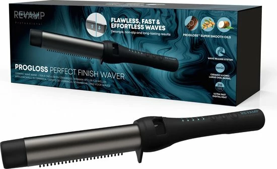 Om zichtbaar glad en glanzend haar te garanderen, is de Revamp Progloss Perfect Finish Waver doordrenkt met onze unieke combinatie van Progloss ? supergladde oli?n, waaronder keratine, arganolie en kokosolie.