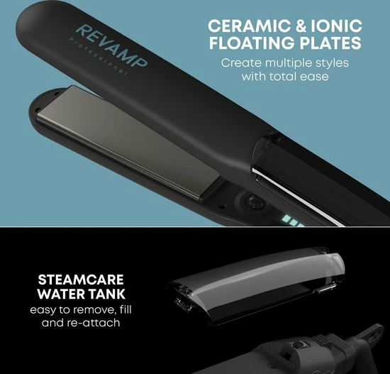Houd je haar gehydrateerd en cre?er zijdezachte kapsels met de Revamp Progloss Steamcare stijltang. Deze geavanceerde stijltang is gebouwd met een slanke stoomkamer om een ??continue stoomstroom te produceren, het natuurlijke vocht van je haar vast te houden en uitdrogen te voorkomen. Zorg voor langdurige resultaten met een ultragladde afwerking. Personaliseer je stylingervaring met instelbare temperatuurinstellingen van 150 ? C tot 230 ? C. Of je nu je lokken wilt gladstrijken of veerkrachtige krullen wilt cre?ren, door het strakke ontwerp van deze stijltang kun je moeiteloos verschillende stijlen cre?ren. Met een afneembaar waterreservoir voor eenvoudig bijvullen. Inclusief hittebestendige siliconenmat.