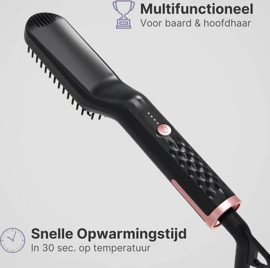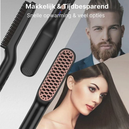 De stijltang is perfect voor het stijlen van zowel je baard als je hoofdhaar. Nooit meer moeilijk doen met verschillende borstels of stijltangen. De kam verbetert daarbij meteen de bloedcirculatie van je hoofdhuid, wat je haar sterker en gezonder kan maken. Alles in ??n met deze stijltang!