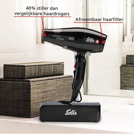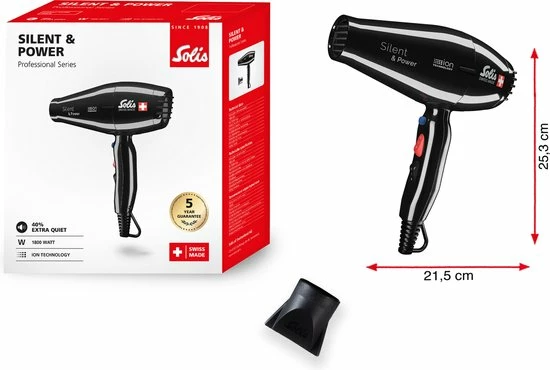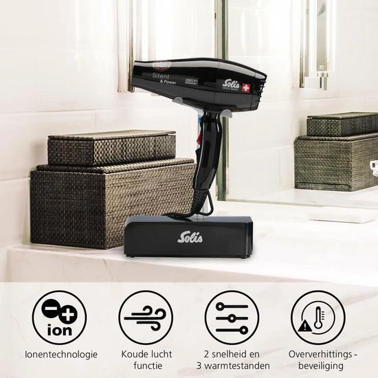 De Solis Silent & Power 449 f?hn is snel, krachtig en 40% stiller dan vergelijkbare professionele f?hns. De haardroger beschikt over verschillende droogstanden en ionentechnologie. Met de Solis Silent & Power ondervindt niemand hinder van jouw ochtendroutine, want het geluid van deze extreem stille haardroger komt maar nauwelijks voorbij de badkamerdeur.