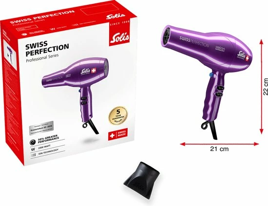 De Solis Swiss Perfection is een prijswinnende haardroger, de f?hn is meerdere keren verkozen tot winnaar van ?The Hairworld World Cup?. Naar wens kun je deze haardroger combineren met de Solis Superflex Softstyler of de Solis Smart Silencer.