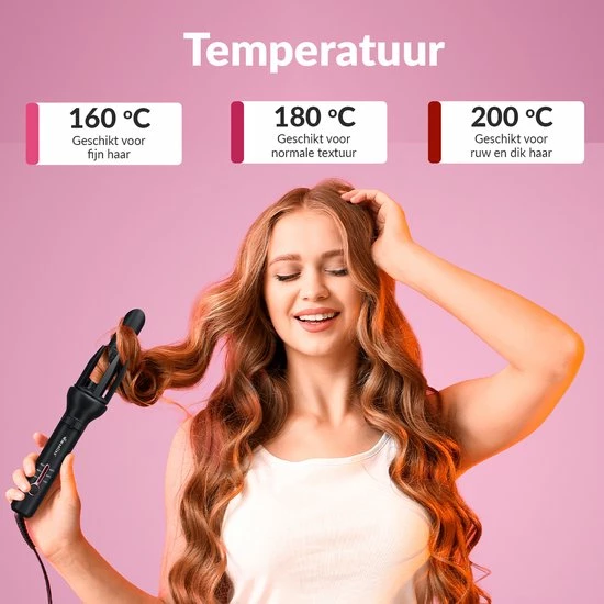 De keramische coating vermindert kroezen en zorgt voor gelijkmatige verdeling van de warmte voor bescherming en extra glans. De krachtige verwarmer verwarmt direct en gelijkmatig, tot 230 graden voor langdurige krullen en golven. Met de 3 verschillende warmteniveaus (170, 200 en 230 graden) kun je je look aanpassen en kiezen tussen losse, medium of strakke krullen. Jij hebt de volledige controle!